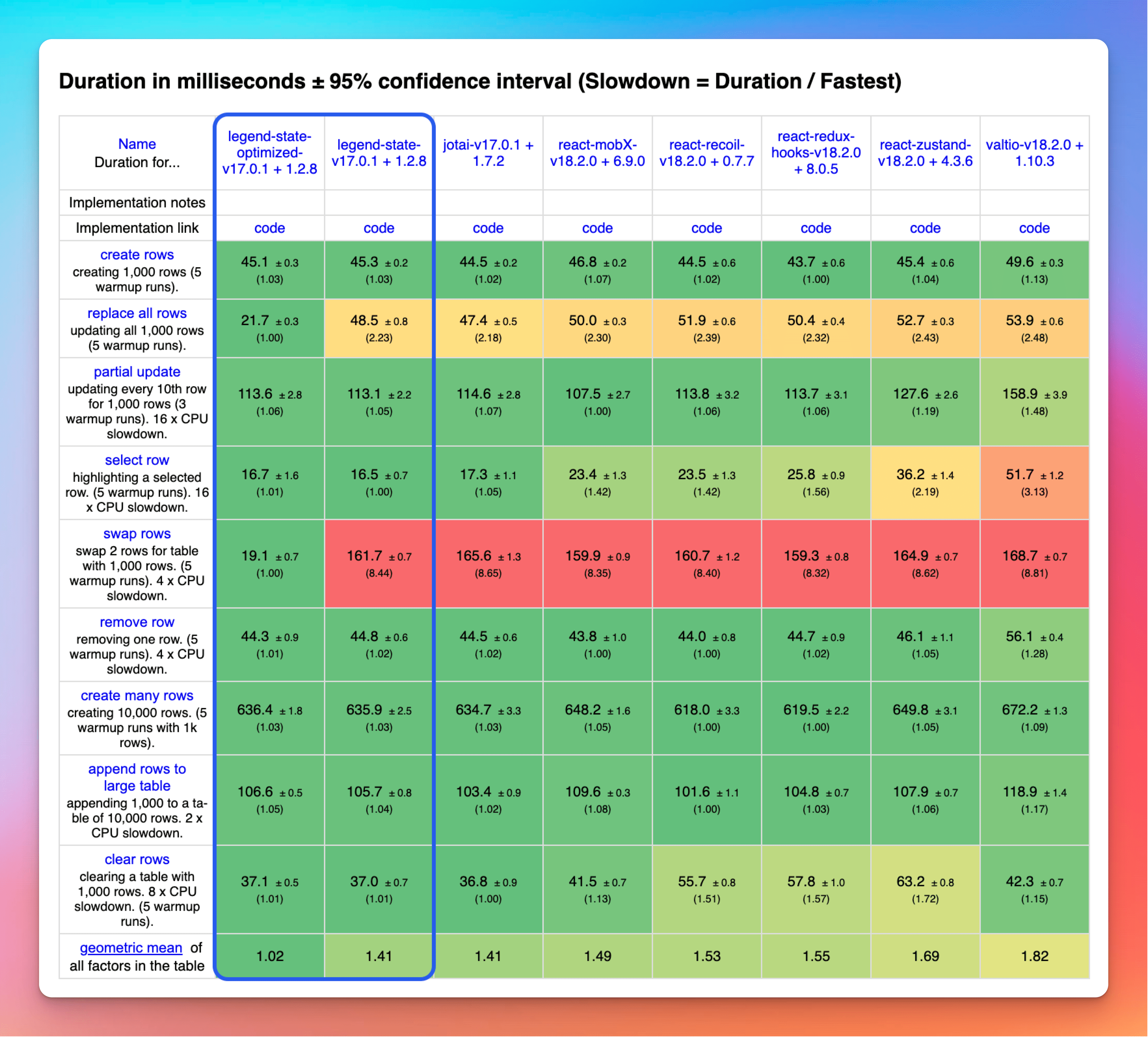 While upgrading and optimizing Legend's state system to use it as the basis of the new backend, we found that it had become really delightful to use and is faster than other popular React state libraries.