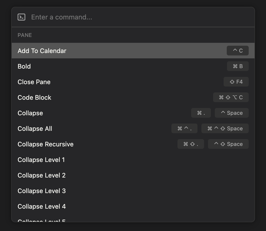 Open the Command Palette by pressing + P to see all of the various commands available in Legend. You can use this to quickly find actions you don't remember the hotkey for, or just explore all of the options. Additionally we've added some new commands that don't currently have hotkeys. You can customize the hotkeys in the Hotkeys section of the settings, and please let us know in the forum if you have suggestions for what the default hotkeys should be.