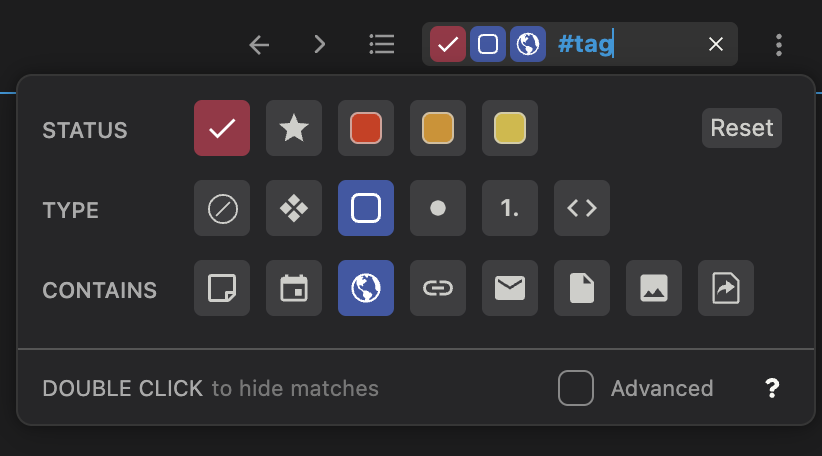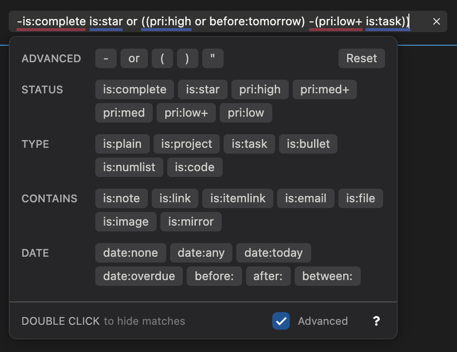 Advanced mode takes away the icons and adds a ton of extra functionality for when you want to get more specific. In advanced mode you can mix filters together with text, group filters together with parentheses, and OR them together, to filter exactly how you want.