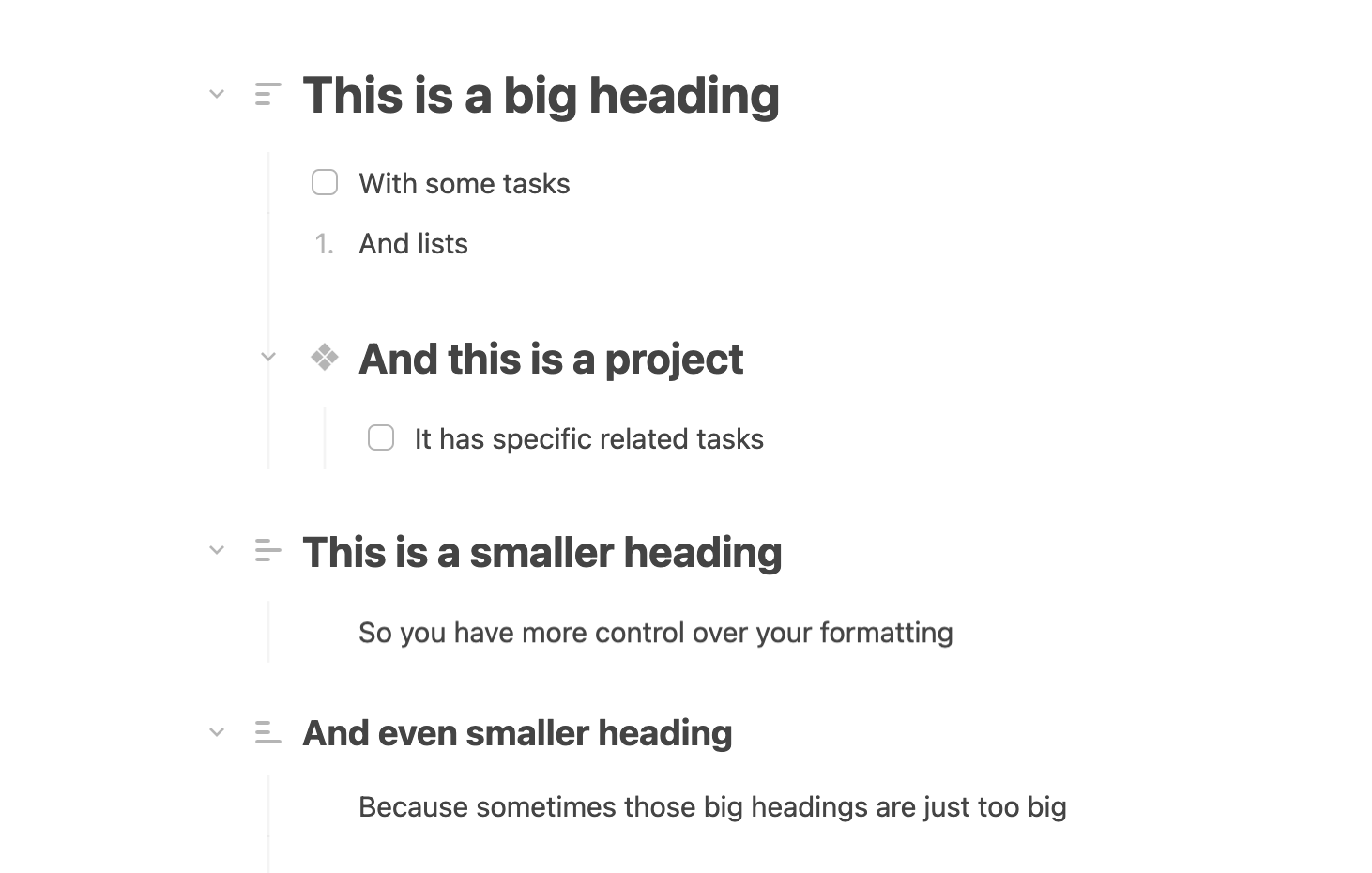 You can now use Heading size to create a hierarchy. So items below an H1 will be considered its children, and an H2 creates another level of hierarchy.